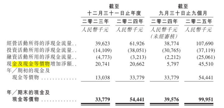 截至2025年9月底,公司现金及现金等价物为9995.1万元,较2024年底的5444.1万元大幅增加,但相较扩张所需的资金,公司表示,主要通过经营活动所得现金、银行借款及IPO募资来满足资金需求。